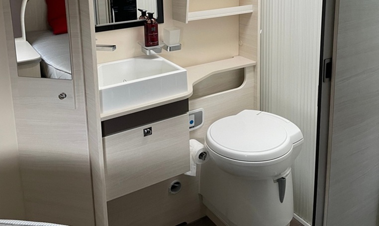 Highly sought-after layout with a stepless height-adjustable central double bed (queen bed) at the rear (160x200 cm) and a drop-down bed for 2 people above the cab (140x200 cm).
