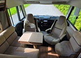 The lounge area is roomy, featuring an L-shaped seating group and two swiveling front seats. The table is mounted on a central pillar and can be adjusted in all directions.