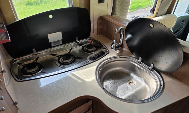 The kitchen is spacious, equipped with a countertop and a 3-burner stovetop. The motorhome also has a large refrigerator with a separate freezer compartment.