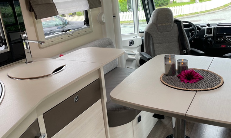 Highly sought-after layout with a stepless height-adjustable central double bed (queen bed) at the rear (160x200 cm) and a drop-down bed for 2 people above the cab (140x200 cm).