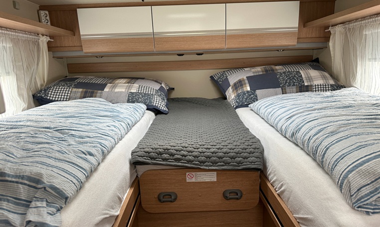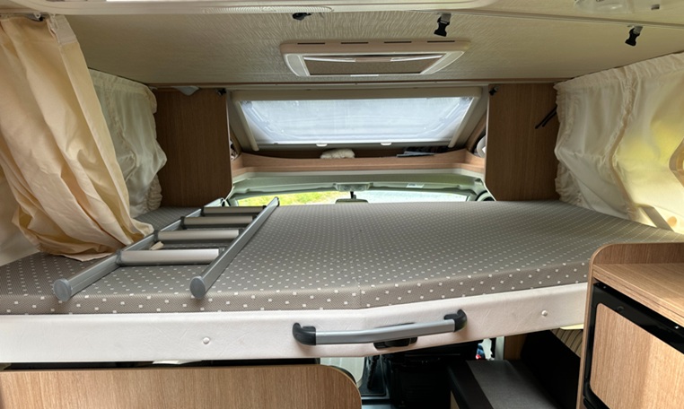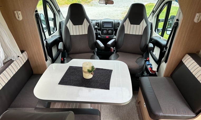 Lounge Area Spacious L-shaped lounge + 60 cm wide side seat. Height-adjustable table measuring 91 x 70 cm (can be adjusted sideways). 2 overhead cabinets, 1 shoe cabinet by the living area door, 4 ceiling lights, 2 lights under overhead cabinets + LED strips. Drop-down bed above the lounge. Insect screen door installed.